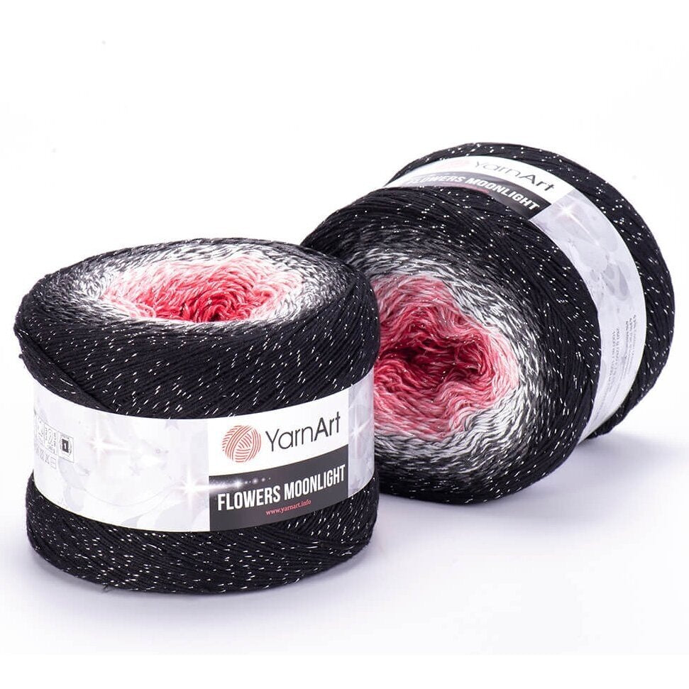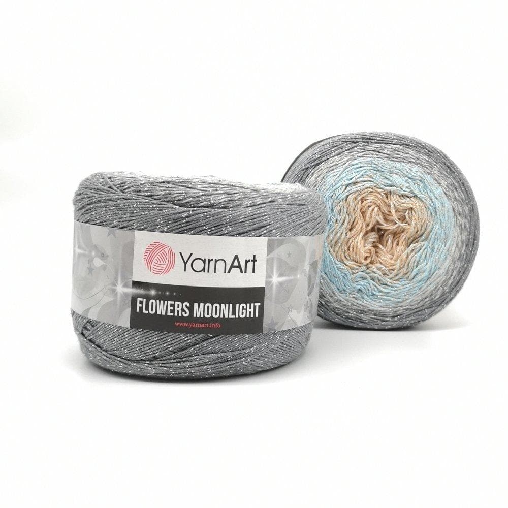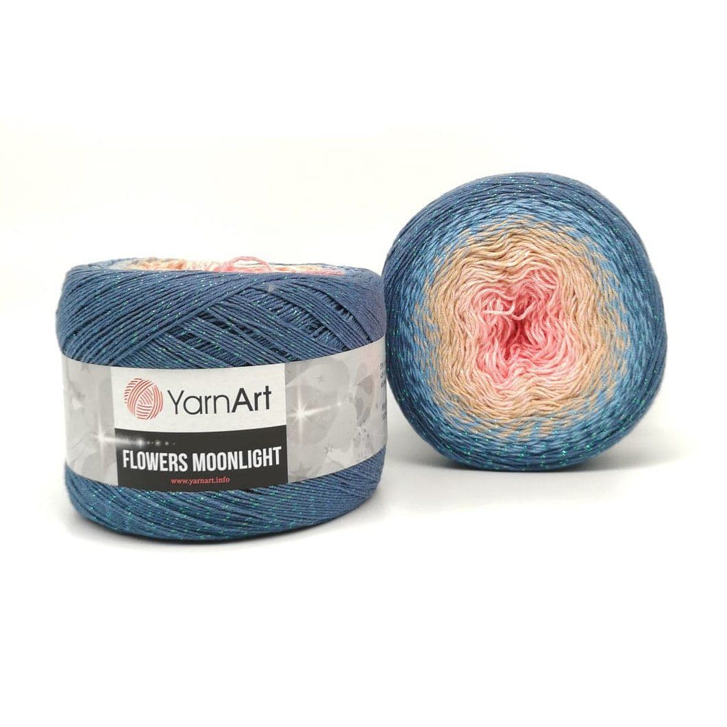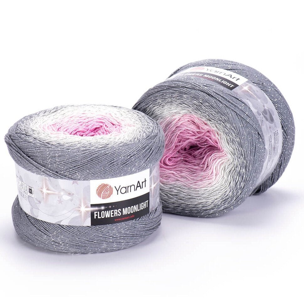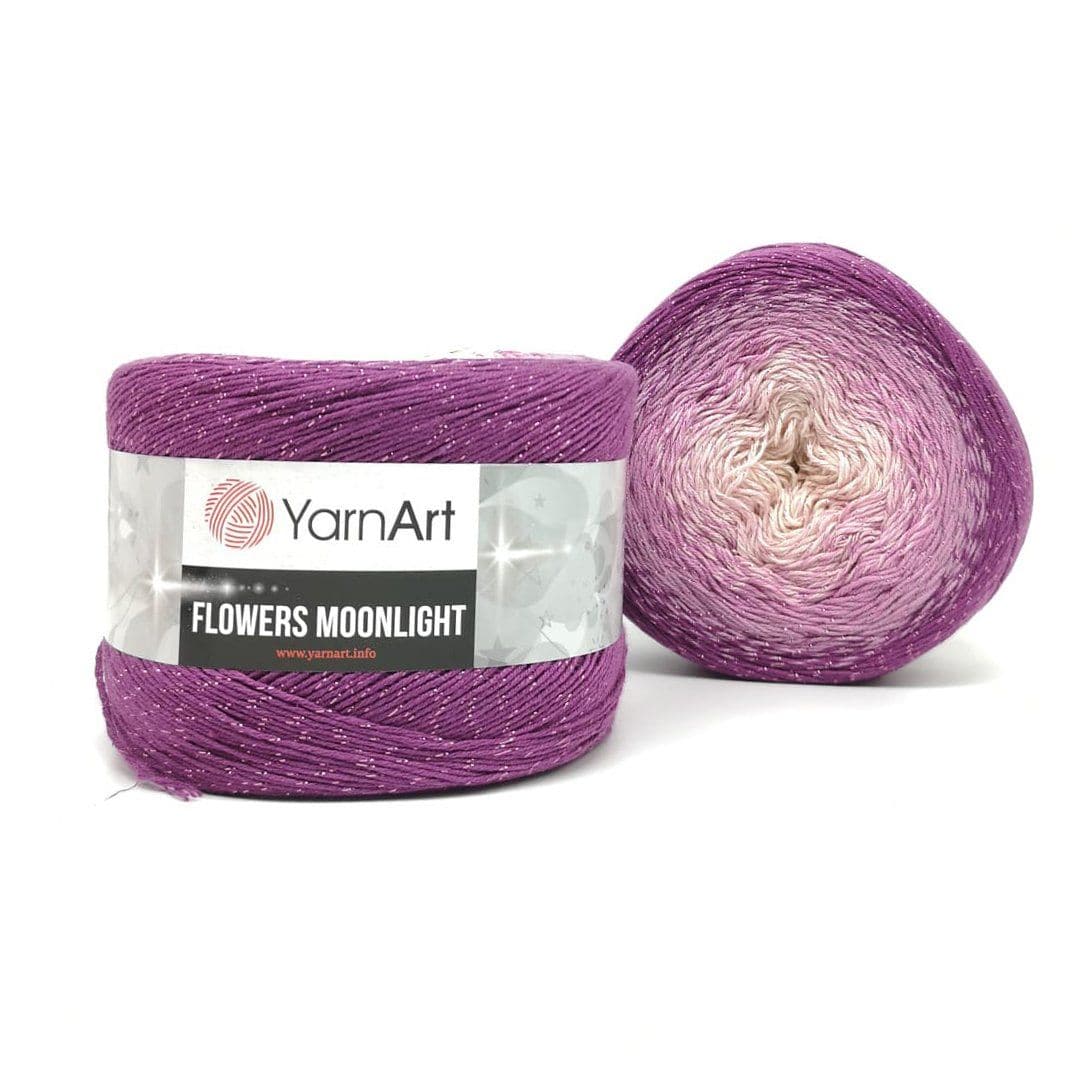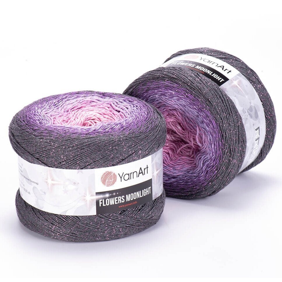 YarnArt Flowers Moonlight adds a sprinkle of magic to the legendary Flowers collection. This generous cake yarn features the same beloved soft cotton blend and seamless color transitions, but with an added metallic thread (Lurex). The result is a fabric that glimmers subtly like moonlight on water, making it the ultimate choice for evening shawls, elegant stoles, and summer tops that need a bit of glamour.