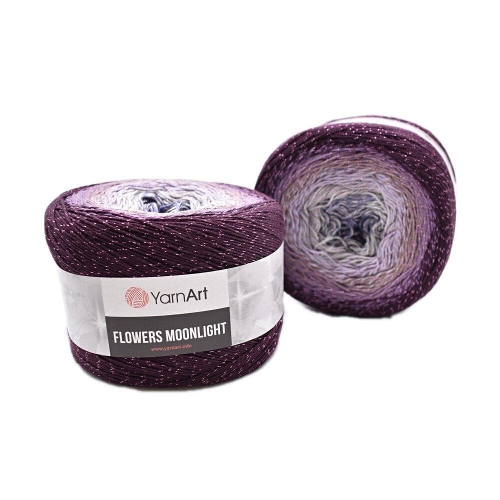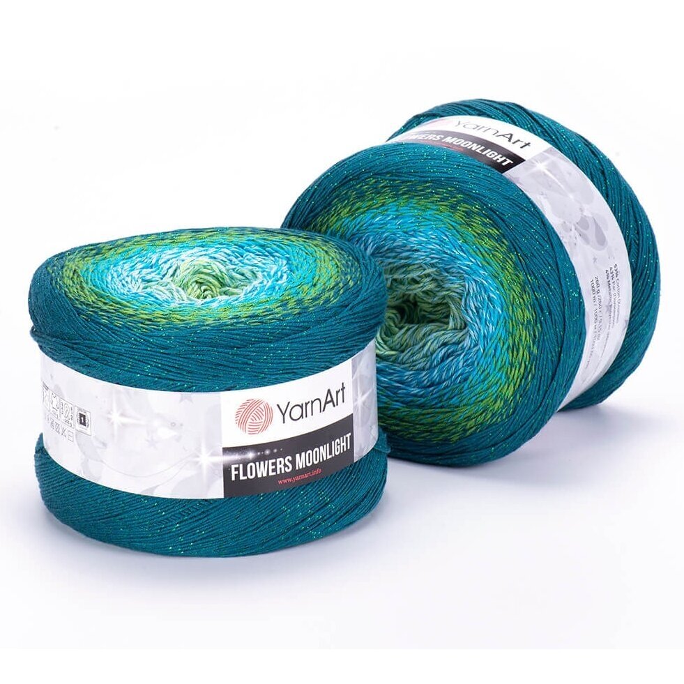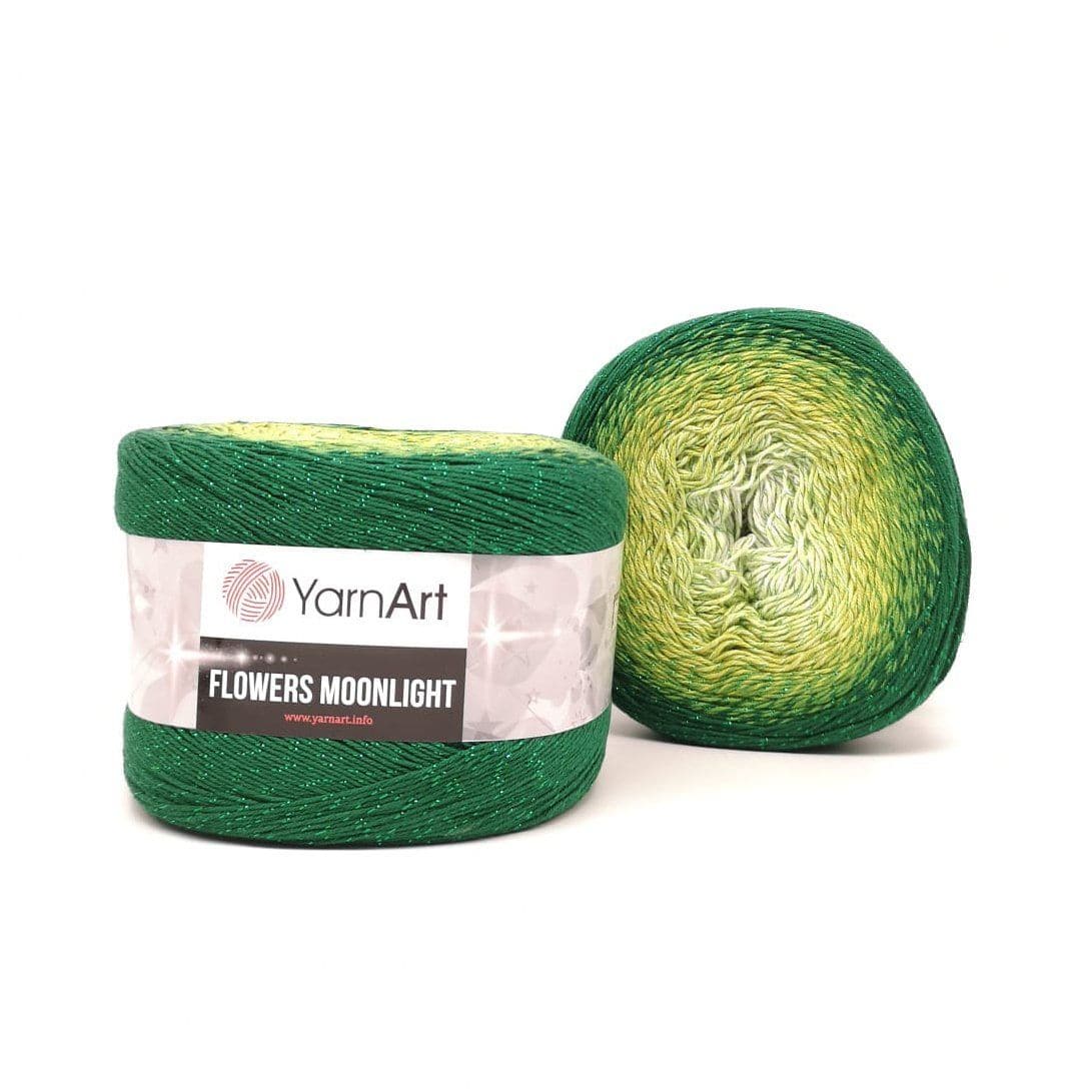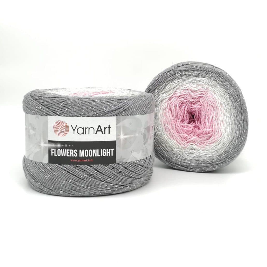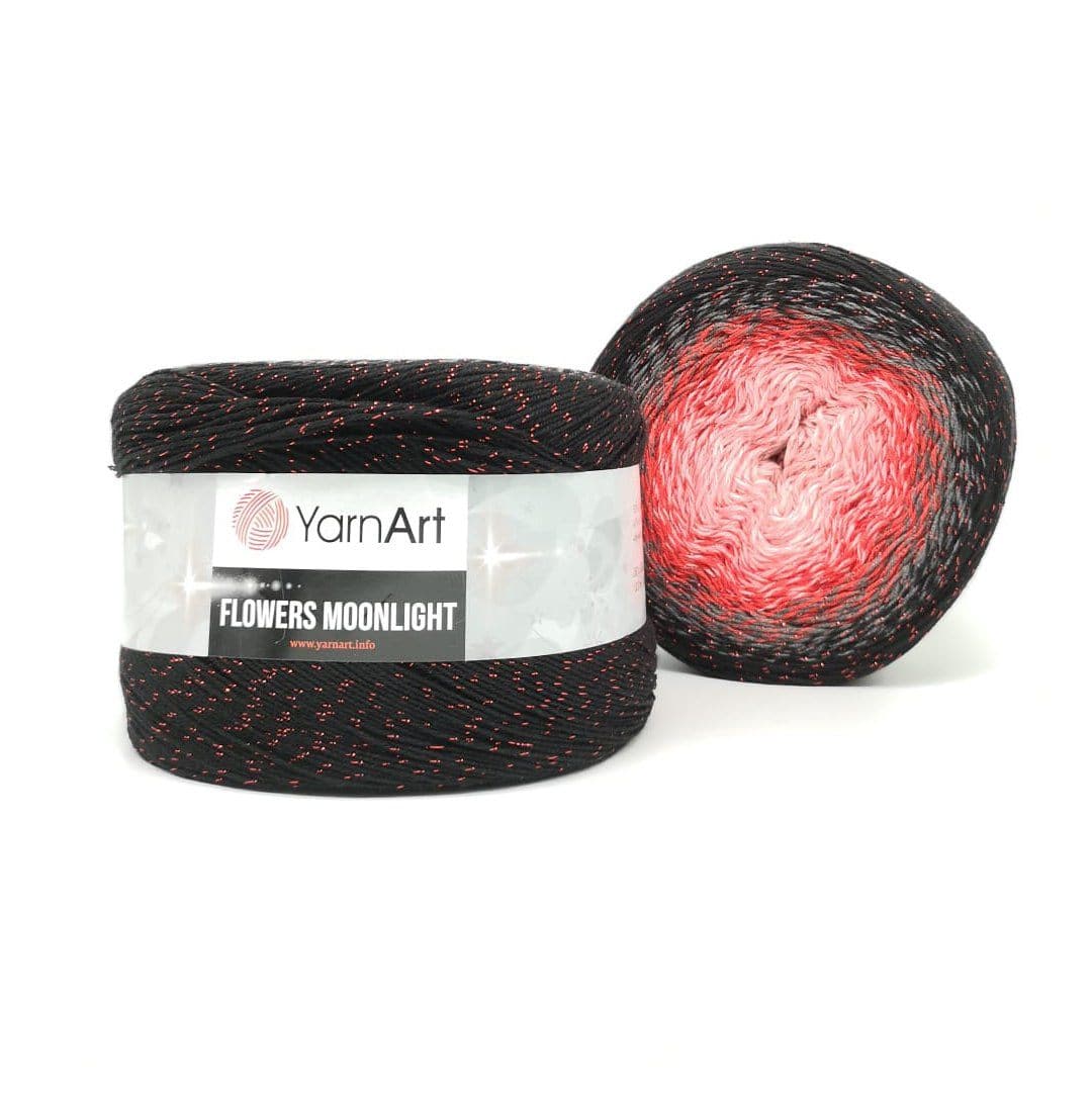 YarnArt Flowers Moonlight adds a sprinkle of magic to the legendary Flowers collection. This generous cake yarn features the same beloved soft cotton blend and seamless color transitions, but with an added metallic thread (Lurex). The result is a fabric that glimmers subtly like moonlight on water, making it the ultimate choice for evening shawls, elegant stoles, and summer tops that need a bit of glamour.
