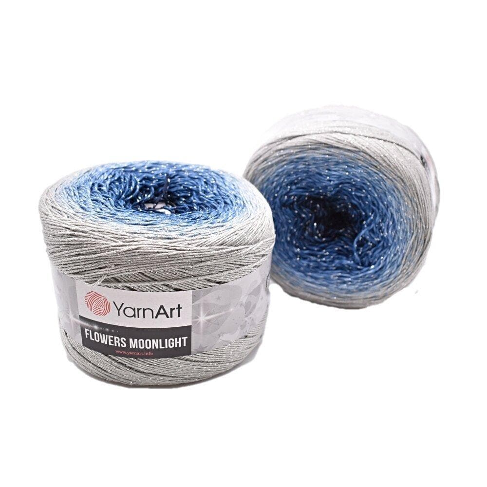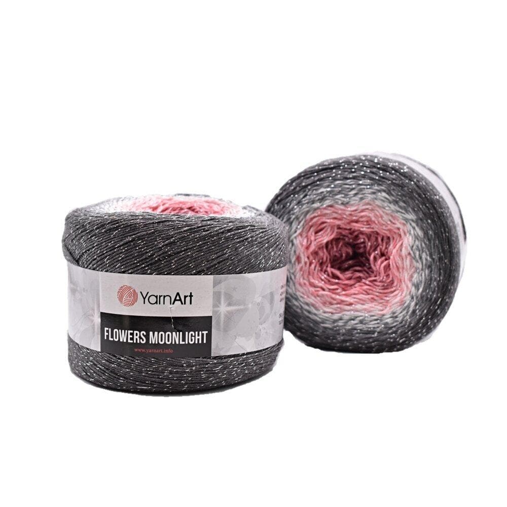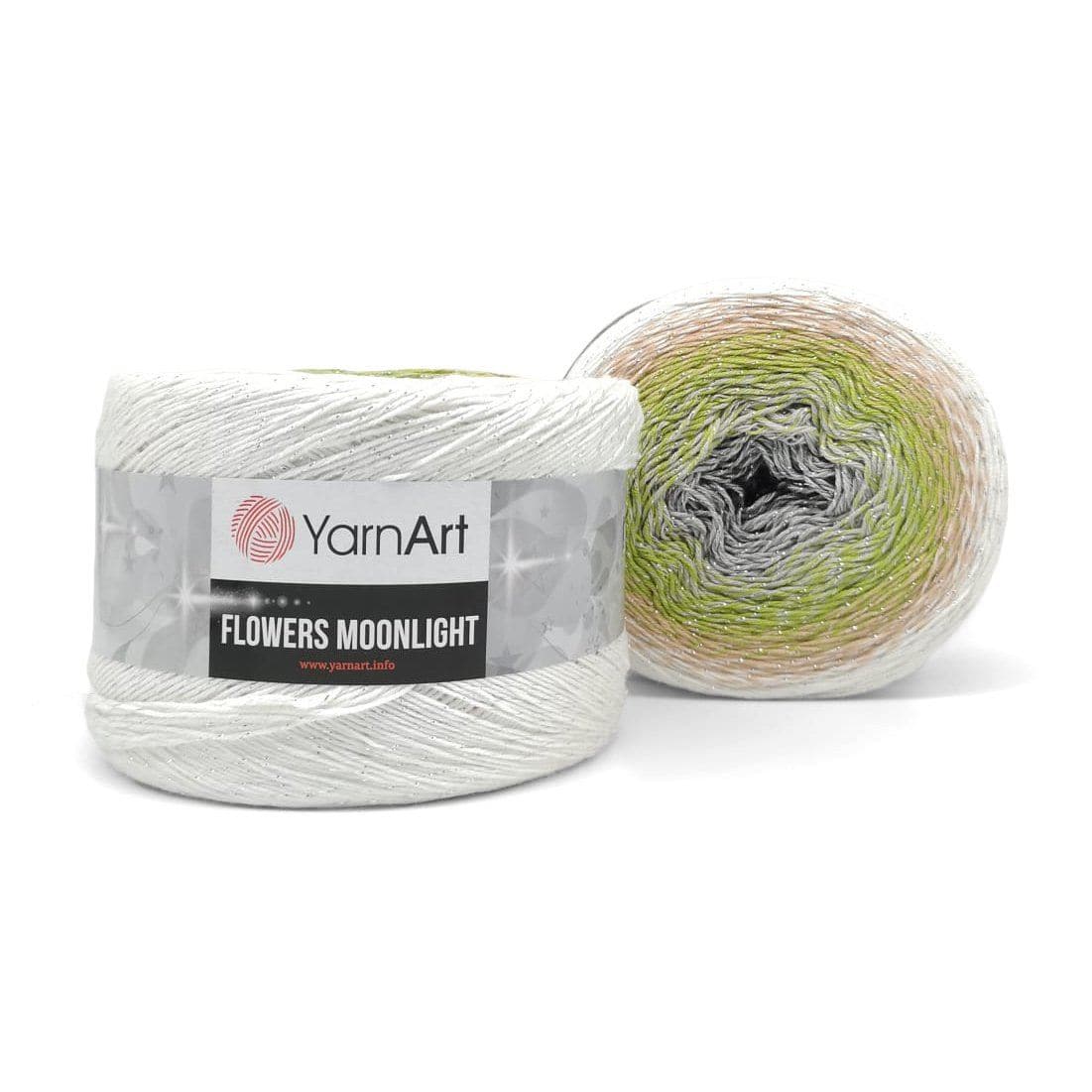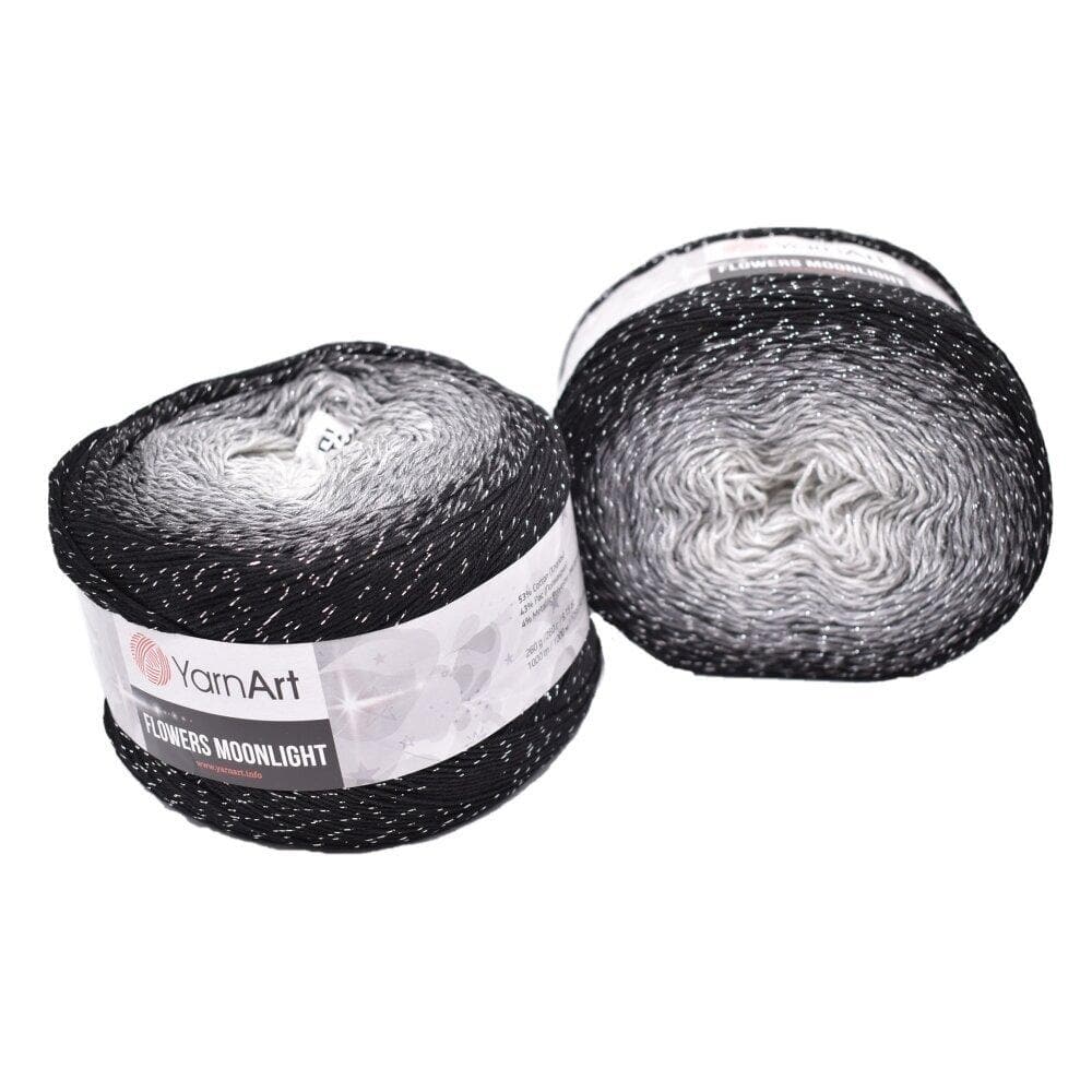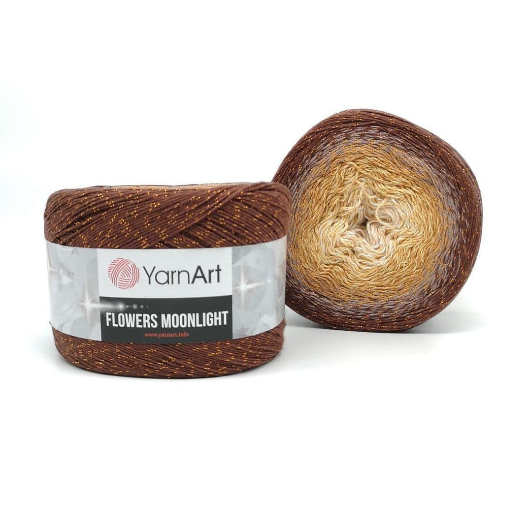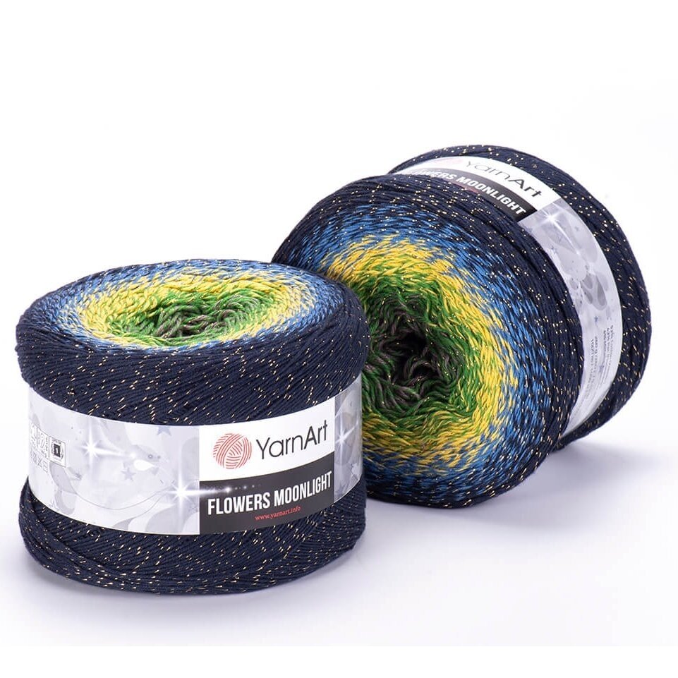 YarnArt Flowers Moonlight adds a sprinkle of magic to the legendary Flowers collection. This generous cake yarn features the same beloved soft cotton blend and seamless color transitions, but with an added metallic thread (Lurex). The result is a fabric that glimmers subtly like moonlight on water, making it the ultimate choice for evening shawls, elegant stoles, and summer tops that need a bit of glamour.